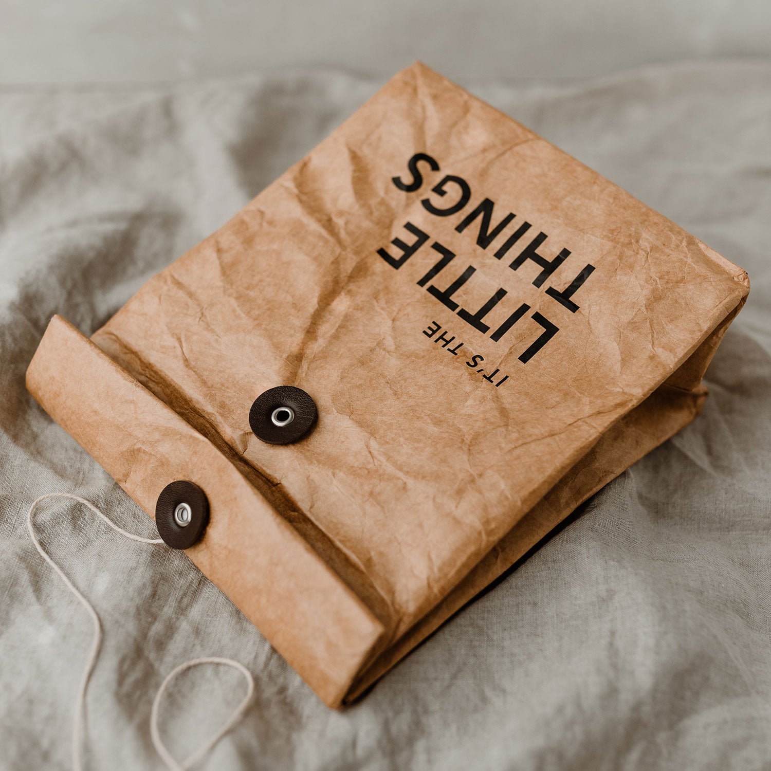Die kleine Kühltasche in toller Beuteloptik ist perfekt für die Tasche, um Etwas kühl zuhalten. Ob auf dem Weg zur Arbeit, für ein kleines Mini-Picknick, den Weg vom Einkaufen nach Hause oder aber auch für eine Autofahrt. Sie ist aus waschbarem Papier gefertigt und innen mit einer dünnen Isolierschicht ausgestattet. Das macht sie nicht nur optisch zu einem absoluten Highlight, sondern auch noch mega praktisch, da sie wundervoll leicht ist und jederzeit einfach mit einem nassen Lappen abgewischt werden kann. Die Vorderseite der Tasche ziert der Spruch "It's the little things" und die Rückseite ein kleines Eulenschnitt Logo.